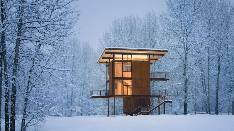 Malownicza zimowa sceneria to szczególnie o tej porze roku miły dla oka krajobraz. Wpisany jest w niego domek zaprojektowany przez Toma Kundiga, jedną z czołowych postaci zespołu projektowego w Olson Kundig Architects. Na pierwszy rzut oka nie przypomina typowego domku letniskowego. Bardziej przywodzi na myśl jakąś strażnicę, nowoczesną leśniczówkę, posterunek graniczny albo obiekt służb ratowniczych. Moim zdaniem o to chodzi w ciekawej architekturze, aby nie myśleć szablonowo, ale łamać schematy i twórczo zaskakiwać.