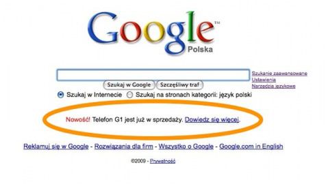 Przy pomocy linka reklamowany jest najnowszy telefon Google - G1, który wykorzystuje znaną platformę - Android. Od poniedziałku urządzenie to dostępne jest również w Polsce. Google już drugi raz decyduje się na tego typu reklamę - pierwszy raz mieliśmy okazję oglądać podobny link promocyjny po publicznym udostępnieniu przeglądarki Chrome.