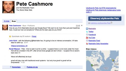Jak wygląda Google Buzz możecie zobaczyć między innymi na oficjalnym koncie Mashable, które prowadzi Pete Cashmore: