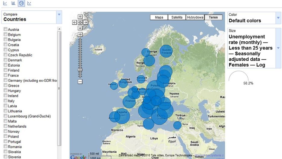Google uruchomił laboratorium o nazwie Google Public Data Explorer (prezentował je zresztą wstępnie latem ubiegłego roku, na konferencji prasowej w Warszawie), dostępne pod adresem http://www.google.com/publicdata/home. Jest to poszerzany sukcesywnie zbiór wizualizacji oparty na publicznie dostępnych danych statystycznych - na razie mamy do dyspozycji kilkanaście zbiorów danych, głownie dotyczących zresztą Stanów Zjednoczonych.