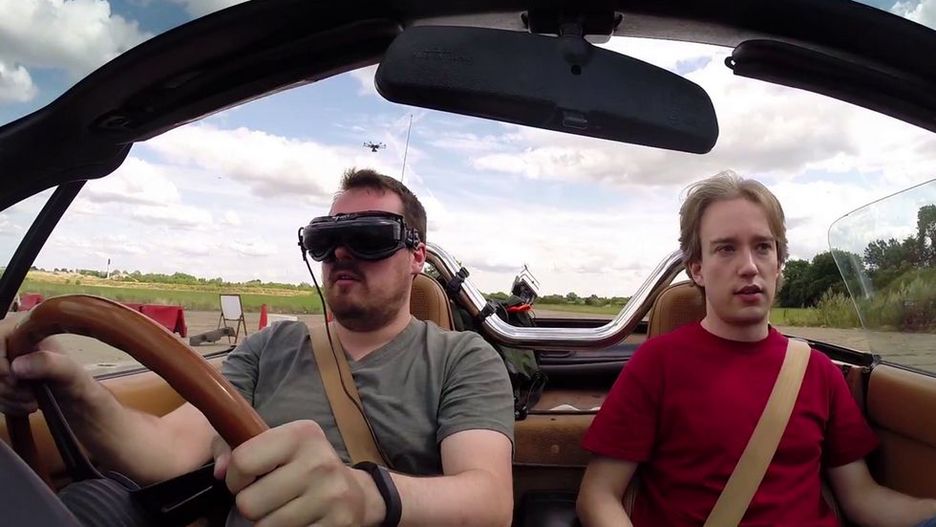 Do czego może przydać się dron? Zamiast strzelania do talibów i dostarczania pizzy, można wykorzystać go do ciekawego eksperymentu. Polega on na tym, że dron lecący za samochodem przekazuje rejestrowany kamerą obraz do gogli, założonych przez kierowcę. W praktyce oznacza to, że kierowca prowadzi własny pojazd, widząc go jak w grze – z perspektywy trzeciej osoby.