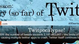 Drugą próbę przedstawienia historii Twittera (według mnie o wiele ciekawszą) za pomocą obrazka stworzył blog Manolith.com. Wzorowano się oczywiście grafice ze strony 600series. Historia przedstawiona podobnie jak na pierwowzorze w postaci drzewa ma swój początek w 1980 kiedy to pojawił się UNIX "Talk", a kończy się na Twitpokalipsie.