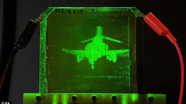 Widoczny na zdjęciu obrazek F-4 Phantom został naniesiony na polimer załamujący światło. Obraz trójwymiarowy można na nim oglądać bez konieczności używania okularów. Doktor Nasser Peyghambarian, który prowadzi badania nad tą technologią, mówi o przyszłości z holografią.