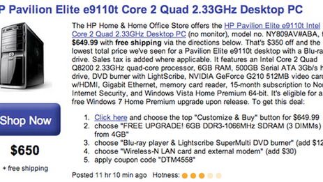 Przynajmniej można odnieść takie wrażenie. Owa stronka, którą widzicie na górze, to swego rodzaju chwyt marketingowy. Komputer rzeczywiście kosztuje te 650$ w podstawowej konfiguracji (z kilkoma darmowymi upgrade'ami), ale za niektóre trzeba zapłacić. Strona źródłowa podała, że w tej cenie dostaniemy Core 2 Quad, 6GB RAM i napęd Blu-ray. Sprawdziłem i mogę się zgodzić z dwoma pierwszymi. Blu-ray kosztuje już dodatkowe 120$. A podany kod nie działa!