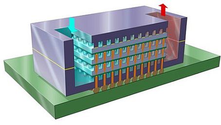 Trójwymiarowe układy scalone (3-D IC) składają się przynajmniej z dwóch warstw zintegrowanych w pojedynczy układ i to one właśnie są przyszłością technologii mikroprocesorowej. Takie układy można wydajniej niż zwykłe chłodzić za pomocą kanalików z wodą poprowadzonych pomiędzy warstwami. Tak przynajmniej uważają inżynierowie z laboratoriów IBM w Zurichu, razem z kolegami z Instytutu Fraunhofera w Berlinie.