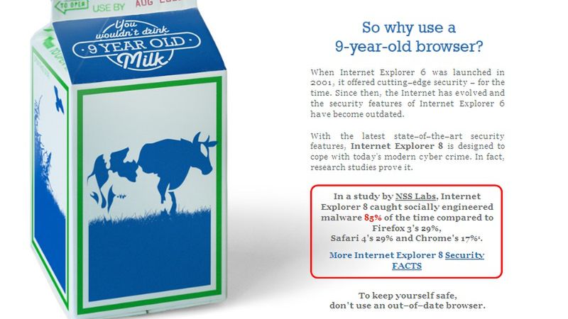 "Nie chcesz pić dziewięcioletniego mleka, dlaczego korzystasz z dziewięcioletniej przeglądarki?", pyta Microsoft w swojej najnowszej kampanii zwróconej do użytkowników Internet Explorer 6. Marketingowcy z Redmond twierdzą, że spożywcze porównanie przekona ludzi do pobrania IE8, którego największą zaletą ma być bezpieczeństwo.