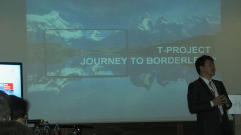9:42 - Pan Lee tłumaczy T w T-Project, ale niezbyt ciekawie (turning point). Robi to chyba jednak zbyt długo bo jego kolega stojący z drugiej sali podnosi rękę do góry i puka mocno w zegarek. Opis wizji firmy, jej podróży jak mówi właśnie K.S. Lee ma w zwyczaju przedłużanie się.