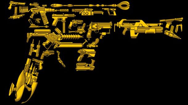Na pojedynczy tytuł przypada jedna broń. Autor ilustracji podpowiada również, że jeden egzemplarz spośród uwiecznionych na koszulce broni pochodzi z kreskówki i jeden z anime.