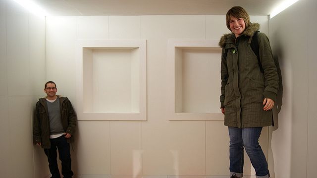 Na zdjęciu powyżej widzicie Pokój Amesa. Dzięki specyficznemu układowi ścian obserwator ma wrażenie, że widzi przed sobą nienaturalnie wysoką kobietę i mężczyznę o wzroście lalki. Co powiecie na iluzję optyczną, w której to sam obserwator czuje się, jakby był niewielką lalką?