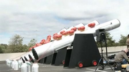 Trzeba przyznać, że mają chłopaki zakręcone pomysły. Pięciu śmiałków (rzekomo pracowników Intel Finlandia) wlazło do gigantycznych armat i dało się wystrzelić wprost na metalowe rury. Jak to dobrze, że mieli kaski na swoich głowach… bez tego nie byłoby pożądanego efektu!