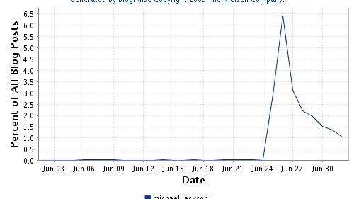 Na powyższym wykresie z Blogpulse widać ile procent wpisów w blogosferze wspominało o Michaelu Jacksonie przez ostatnie dni. Spadek zainteresowania można również zauważyć na Diggu i Youtube, gdzie wideo i tematy związane z Jacksonem szybko spadają z listy najpopularniejszych.
