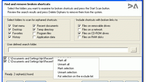 OrphansRemover umożliwia usunięcie skrótów, które nie prowadzą do żadnej konkretnej lokalizacji (której albo już nie ma, albo się zmieniła). W aplikacji wystarczy zaznaczyć które obszary mają zostać przeanalizowane, a następnie uruchomić proces skanowania.