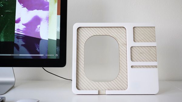 Podstawka zrobiona z tworzyw sztucznych i sklejki została tak pomyślana, żeby nie tylko zebrać wszystkie gadżety w jednym miejscu, ale również umożliwić łatwe ich ładowanie i podłączanie. Gdy jeszcze dołożyć osobną klawiaturę, całość wygląda prawie jak w pełni funkcjonalny komputer.