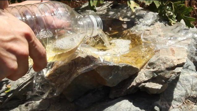 Wszystko, co jest potrzebne do rozpalenia ognia zademonstrowanym na nagraniu sposobem, to pełny pęcherz, plastikowa folia i kilka kamieni, z których przygotowuje się podstawkę pod foliową „miskę”.