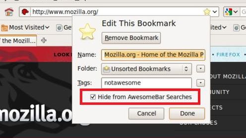Po pobraniu i instalacji możemy przystąpić do działania. Podczas zapisywania danej strony www w zakładkach (lub w czasie ich edytowania) pod paskiem Etykiety (Tags) znajdziemy opcję Hide from AwesomeBar Searches. Zaznaczamy ją haczykiem i klikamy w przycisk Gotowe (Done).