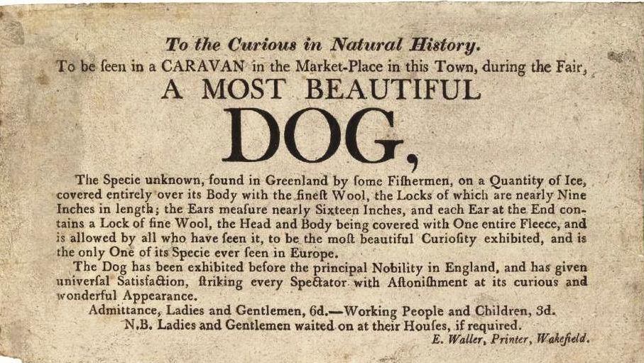 „Zaciekawionych historią naturalną” zapraszano również na prezentację „najpiękniejszego z psów”, znalezionego przez rybaków na Grenlandii. Niezwykły pies, „w całości pokryty najszlachetniejszą wełną”, miał „zachwycać wszystkich zebranych swoją niezwykłością i nadzwyczajną urodą”. Nie podano, jakiej był rasy, jednak ulotka zapewniała, że to jedyny taki pies w całej Europie.