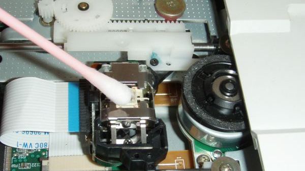Za pomocą patyczka do uszu lub waty wyczyśćcie soczewkę lasera. Najlepszy do tego celu byłby płyn do mycia szyb, ale posłużyć możemy się również innym specyfikiem na bazie alkoholu. Zmoczcie dobrze końcówkę patyczka i śmiało dokładnie na środku i w zakamarkach wytrzyjcie soczewkę lasera. Zabrudzona soczewka nie skupia dobrze świata, a napęd przestaje sobie radzić ze sprawnymi płytami CD. Następnie suchą stroną patyczka lub wacikiem wytrzyjcie resztki płynu z soczewki. Nie dotykajcie lasera palcami! Tłuszcz i brud mocno wpływa na jego sprawność.