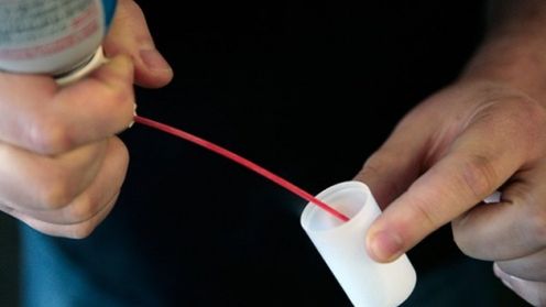 - Delikatnie naciskamy na „spust” sprayu, wpompowując 0,5 cm przezroczystego płynu do pojemnika po kliszy filmowej. UWAGA! Płyn jest bardzo zimny, więc nie naciskajcie zbyt mocno na „spust”. Wejście cieczy w kontakt ze skórą byłoby dość bolesne.