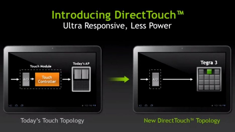 Pomocną rękę wyciąga Nvidia, wskazując na procesor Tegra 3. Oprócz czterech głównych rdzeni zajmujących się najbardziej wymagającymi zadaniami układ ma piąty, energooszczędny rdzeń przeznaczony do pozostałych procesów. Technologia DirectTouch wykorzystuje właśnie ten dodatkowy element, żeby obsługiwać ekran dotykowy, jednocześnie zwiększać jego czułość i zmniejszać zużycie energii.