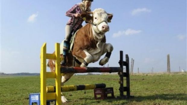 Regina Mayer trenuje trzyletnią krowę o imieniu Luna od około sześciu miesięcy. Dziewczyna kontaktowała się nawet ze szwajcarskimi specjalistami od jazdy konnej w celu uzyskania kilku porad co do jazdy na krowie. Dziś krówka potrafi skoczyć na wysokość prawie metra. Wkrótce uda się pokonać przeszkody o wysokości 1,2 metra. Ciekawe, czy krowa cieszy się z tego, że nie poszła pod nóż.
