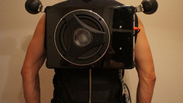 Kamizelka Dainese Gilet Cali Tessuto zintegrowana jest z 8-calowym, aktywnym subwooferem Boss Audio Bass 900. By użytkownik nie musiał szukać gniazdka elektrycznego, strój wyposażono oczywiście w specjalnie przygotowany pas z bateriami. Niezwykły wynalazek dostępny jest w sprzedaży za 850 dolarów (czyli około 2900 zł). Do ceny trzeba doliczyć również koszt wysyłki - kolejne 50 dolarów na terenie Stanów Zjednoczonych. Wysyłka do Europy nie jest możliwa, ale od czego jest rodzina w Stanach :)