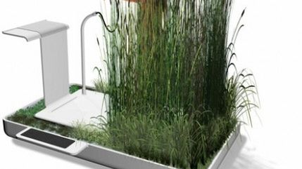 Szara woda, która powstaje po kąpieli, kierowana jest w Phyto-Purification Bathroom and Shower do nawadniania zieleni rosnącej w pokaźnych rozmiarów kuwecie. Podest, na którym staje osoba kąpiąca się, godzien jest pochwały: jest na tyle duży, że pozwala na korzystanie z prysznica z partnerem (na dodatek istnieje możliwość skrycia się w szuwarach, które wyrastają z kuwety). [Piszę szuwarach, ponieważ w kuwecie najlepiej będą się czuły gatunki strefy przybrzeżnej wód słodkich, czyli to, co zazwyczaj zarasta podmokłe pobrzeża jezior czy stawów, np. pałka wodna, tatarak, trzcina, itp...]