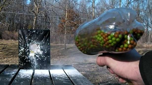 Jeśli pominie się tę niedogodność, to prezentowany wynalazek jest godny uwagi ze względu na swoją prostotę i imponującą siłę ognia. Sama broń to wypełniona plastikowymi kulkami butelka PET z podłączonym źródłem sprężonego powietrza i lufą pozwalającą skierować kulki mniej więcej w kierunku celu (zwolennicy większej precyzji mogą sprawdzić, jak działa pistolet ASG sterowany Wiilotem).