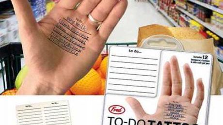 Dawniej dobrą metodą było zapisywanie listy zakupów na przykład na dłoni...Ta metoda uchodzi na sucho jednak tylko dzieciom. Młody japiszon nie poda przecież usmarowanej tuszem ręki przypadkowo spotkanemu w sklepie klientowi. Jest jednak na to sposób - zestaw To-Do Tatoo. Kilka specjalnych samoprzylepnych przezroczystych folii i flamaster i już możemy mieć na dłoni listę zakupową, która w razie potrzeby dyskretnie oderwiemy.