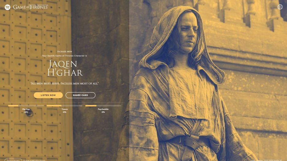 Tym razem jest podobnie - Wspólnie z Evyenem J Kleanem, music supervisorem Gry o Tron, Spotify stworzyło muzyczne profile najbardziej znanych postaci serialu. To właśnie na tej podstawie, serwis przygotował stronę, która przeanalizuje gusta muzyczne fanów serii, a następnie dobierze awatar ze świata Gry o Tron.