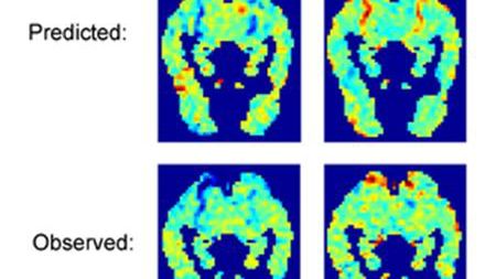 Na zdjęciu widać różnicę w aktywności mózgu podczas myślenia o różnych słowach oraz podobieństwa w obrazach przewidywanych i zaobserwowanych w rzeczywistości.