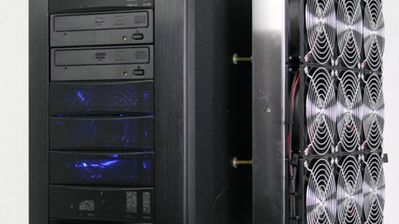 Największy problem był z tym, aby cały zestaw zachował stabilność i w miarę rozsądną temperaturę. Jak widać na powyższym zdjęciu, odpowiedzialnych za to jest aż dziewięć wentylatorów w rozmiarze 120mm. Chyba nie trzeba nikomu mówić, że firma tym samym zrezygnowała z cichego komputera. Najważniejsze jest jednak to, że się udało i procesory grzeją się tylko do 36 stopni w trakcie niskiego obciążenia oraz 45 stopni w trakcie wytężonej pracy.