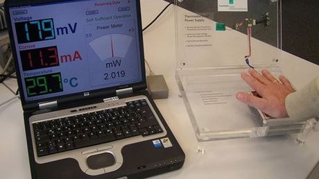 Badacze Fraunhofer Institute stworzyli system, który pozyskuje energię z ciepła ludzkiego ciała i przenosi ją do urządzenia elektronicznego. Wystarczy przyłożyć rękę do specjalnej płytki i voila! Możemy grać w pasjansa na ulubionym laptopie. Co prawda grać jedną ręką, ale jednak.