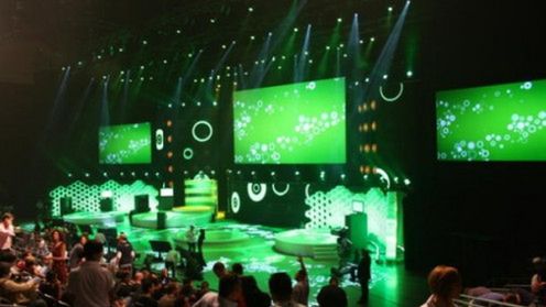 19:03 - a tak ponoć wygląda sala przystrojona przez Microsoft. Jest klasycznie: dużo zielonego koloru, wszędobylskie logo Xboxa 360, wygodne kanapy i kilka podestów: