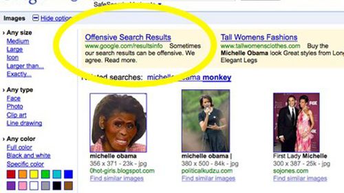 W czołówce obrazków dotyczących pierwszej damy pojawia się jej rasistowska karykatura, umieszczona na jednym z blogów w serwisie Blogspot.com. Pomimo wielokrotnych próśb o usunięcie grafiki, Google tego nie robi, zasłaniając się tym jak działa ich algorytm.