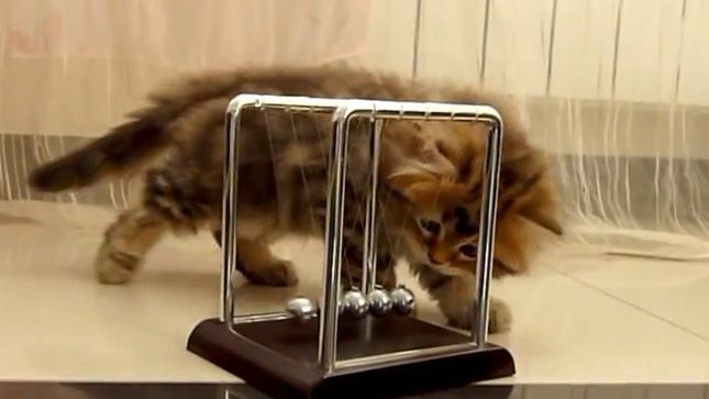 Koty i pomoc naukowa, ilustrująca zachowanie pędu? Okazuje się, że kołyska Newtona może być dla zwierzaków bardzo interesującą rozrywką!