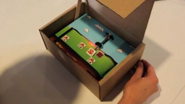 W tej wersji Mario rzeczywiście mieści się w kartonowym pudełku. Po pociągnięciu za sznurek pudełko zostaje otwarte i można rozpoczyna grę. Za pomocą pokrętła sterujemy głównym bohaterem tak, żeby unikać przeszkód stojących na jego drodze. Jeśli tylko uderzymy w jedną z nich gra się kończy, a pudełko automatycznie zamyka. Całość działa dzięki obracającej się taśmie, magnesom oraz prostej elektronice.