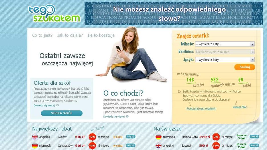 Jeśli mieliście kiedyś problemy ze znalezieniem odpowiedniej oferty kursu językowego, a przy tym nie chcieliście wydawać na naukę majątku, będziecie pewnie żałować, że nie było wcześniej serwisu o zgrabnej nazwie TegoSzukalem.