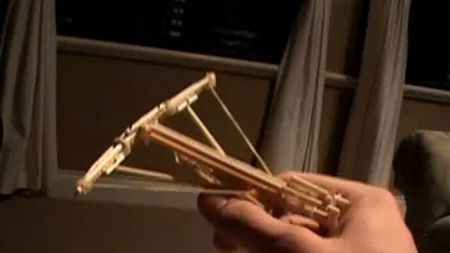 Jedną z nich możecie podziwiać na filmiku poniżej. Konstrukcja została wykonana z materiałów codziennego użytku, takich jak: patyczki po lodach, lizakach oraz szaszłykach. Całość sklejono za pomocą gorącego kleju (takiego z pistoletu ) i uzupełniono gumką, która spełnia rolę cięciwy.