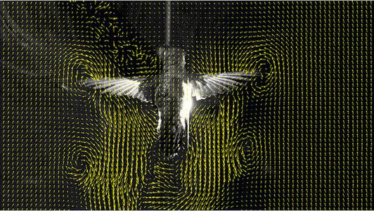 Rozpoznaliście na zdjęciu kolibra unoszącego się w powietrzu? Zielone,strzałki to wektory przedstawiające zawirowania powietrza wywołane uderzeniami skrzydeł maleńkiego ptaka.