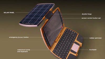 Na poniższym obrazku widoczna jest koncepcja laptopa, który będzie mógł czerpać prąd za pomocą dużej, przyczepianej od góry baterii słonecznej. Projektantka Nikola Knezevic zakłada, że urządzenie posiadać będzie dwie baterie - mniejszą wbudowaną w samego laptopa oraz większą powiązaną z panelem. Dlatego też będzie istniała możliwość odłączenia panelu i położenia go gdzieś gdzie jest najlepsze słońce, a w tym samym czasie pracowanie na drugiej baterii. Laptopa można będzie oczywiście podłączyć również bezpośrednio do prądu.