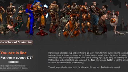 Quake Live umożliwiać ma grę z poziomu przeglądarki - odpadać ma więc instalacja, szukanie serwerów, zakładanie serwerów itd. Brzmi wygodnie? Pewnie. Problem w tym, że fala ciekawskich, która rzuciła się na stronę aby sprawdzić z czym to się je utworzyła zgrabną kolejkę. W chwili gdy zacząłem pisaać ten tekst było ponad 9 tysięcy chętnych, teraz jestem już jakieś trzy tysiące miejsc bliżej.
