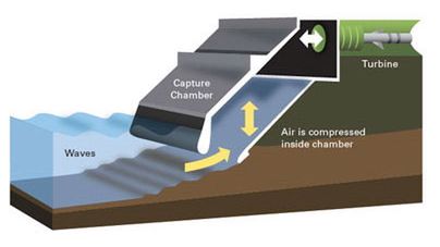 System opiera się na innowacyjnej technice modulacji przepływu powietrza i wody do komory widocznej na powyższej fotografii. W momencie gdy woda wypełnia zbiornik, powietrze tłoczone jest w stronę otworu, wewnątrz którego znajduje się turbina. Ta z kolei zostaje wprawiona w ruch przez wtłoczenie silnego podmuchu. Kiedy woda opuszcza komorę spada ciśnienie powietrza, a obroty turbiny zwalniają. Z każdą następną falą zjawisko powtarza się cyklicznie wytwarzając energię elektryczną.