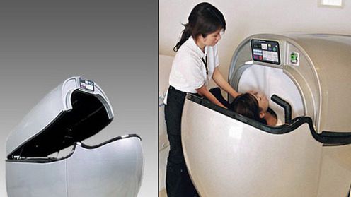 Avant's Santelubain 999 ma kilka talentów. Przede wszystkim, w zupełnie automatyczny sposób potrafi wyczyścić całe ciało, a nawet włosy (szczerze, to nie wiem co robi ta kobieta na zdjęciu skoro producent twierdzi, że jego produkt potrafi zrobić to sam). Przeprowadza aromaterapię, terapię dźwiękową, nakłada balsam na ciało i odżywcze wodorosty.