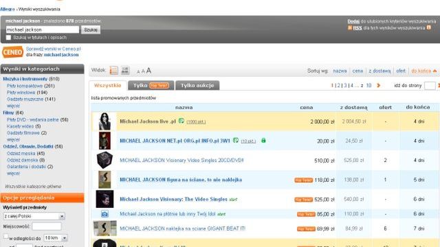 Na Allegro pojawiły się już między innymi domeny z nazwiskiem gwiazdy muzyki pop. Najdroższa www.michaeljacksonlive.pl kosztuje 2 tys. zł! Można jednak kupić tańsze, jak www.michaeljackson.info.pl oraz www.jacko.com.pl. Pełno jest amerykańskich gazet z informacją o śmierci gwiazdy oraz biletów z koncertu w Warszawie w 1996 roku.