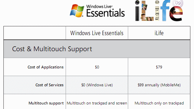 Głównym argumentem chłopaków z Redmond jest fakt, że aby w pełni cieszyć się wieloma opcjami Applowego pakietu iLife potrzebne jest wykupienie konta w serwisie MobileMe (cloud) za 99 dol. rocznie - choć ta sytuacja może zmienić się na dniach (po sieci krążą bowiem pogłoski o możliwym udostępnieniu MobileMe za darmo).