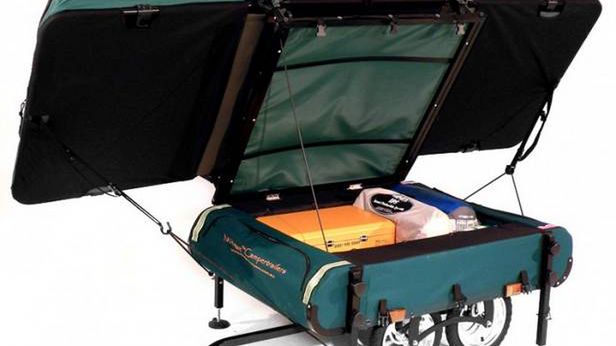 Ta czterokołowa przyczepka nie tylko zapewni holowanie bagażu za rowerem, ale na postojach zamieni się w nietypowy namiot. Dużą zaletą jest fakt, że miejsce do spania o szerokości 80 centymetrów znajduje się nie na ziemi, ale na górze przyczepki (w tym artykule możecie przekonać się, jak działa przyczepka rowerowa z silnikiem).