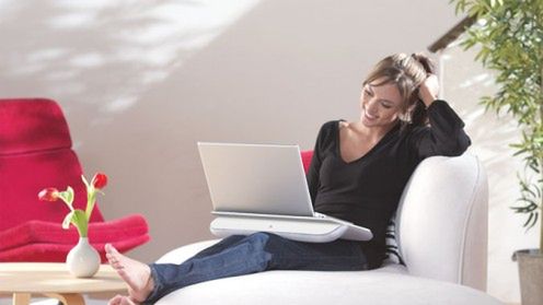 Śnieżnobiała, błyszcząca podkładka pod laptopa nie tylko zapewnia właściwe chłodzenie rozpalonego sprzętu, ale pozwala też bardzo wygodnie ułożyć go na kolanach.