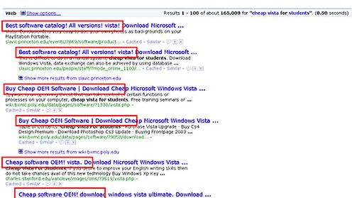 Przykładowo po wpisaniu do Google frazy "cheap vista for students" ("tania vista dla uczniów") pojawia się około 19 milionów wyników - wiele z nich przekierowuje do domeny soft4pcs.com.