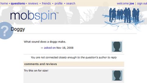 Pamiętacie jeszcze taki polski serwis jak Pytamy.pl? Można było się tam zapytać o coś i dostać odpowiedź w stylu "Może to być nawet guz mózgu w początkowym stadium rozwojowym", a potem wątek z twoim pytaniem i tak zamieniał się w zwyczajne forum dyskusyjne. Zagraniczny serwis Mobspin polega z grubsza na tym samym, ale odpowiedzi zamiast anonimów mają udzielać nasi znajomi.