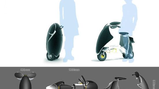 Co powiecie na koncepcję motoru składanego w kształt walizki na kółkach? Byłaby to na dodatek maszyna wyjątkowo przyjazna środowisku, bo napędzana energią słońca. Baterie słoneczne wmontowane w korpus motoru oraz w osłony kierownicy absorbowałyby tyle energii słońca, że nie tylko można by nią napędzić pojazd, ale nawet zyskać nadwyżkę, dzięki której dałoby się jeździć nocą bez użycia paliwa tradycyjnego.